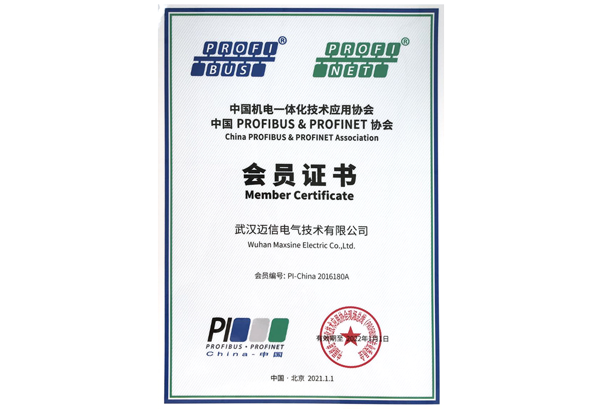 • 2021年度中国机电一体化技术应用单位、中国PROFIBUS&PROFINET协会 会员证书 颁发时间:2021年1月 颁发单位:中国PROFIBUS&PROFINET协会